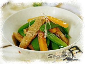 2、炒鍋上火,加油燒熱(rè),放蔥姜片煸香,倒入豌豆莢、裏脊條、南(nán)瓜條翻炒均勻,加入少許高(gāo)湯焖3分(fēn)鐘(zhōng),用(yòng)鹽、味精調味,揀去蔥片、姜片,勾芡後裝盤即可(kě)。